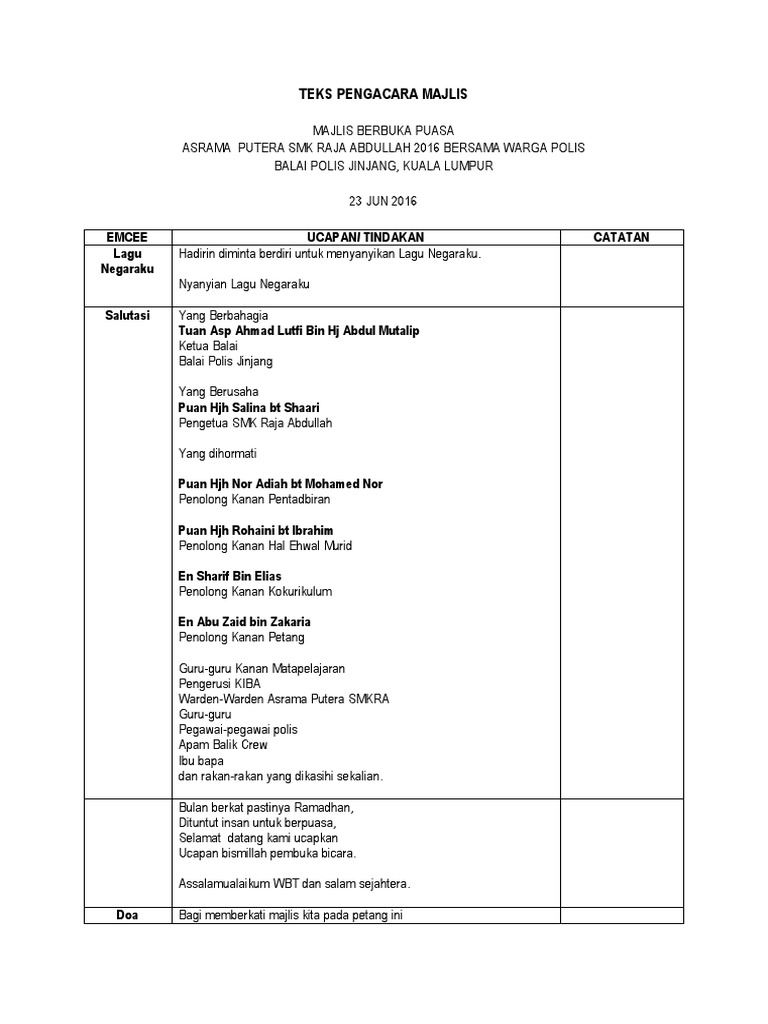 Oleh itu amalan membaca doa dalam Majlis-majlis Rasmi dan Separuh Rasmi Kerajaan adalah suatu amalan yang suci dan murni sesuai dengan kedudukan agama Islam di negara ini. Tuan JEMPUTAN KE MAJLIS IHYA RAMADHAN DAN BERBUKA PUASA 2013 Berhubung perkara yang dinyatakan di atas dimaklumkan bahawa SK Telok Ramunia akan mengadakan Majlis Ihya Ramadhan Dan Berbuka Puasa 2013. Related Posts To Teks Ucapan Pengacara Majlis Berbuka Puasa Bersama Anak Yatim Teks Ucapan Pengacara Majlis Berbuka Puasa Bersama Anak Yatim 2019-11-21T021700-0800 Rating.